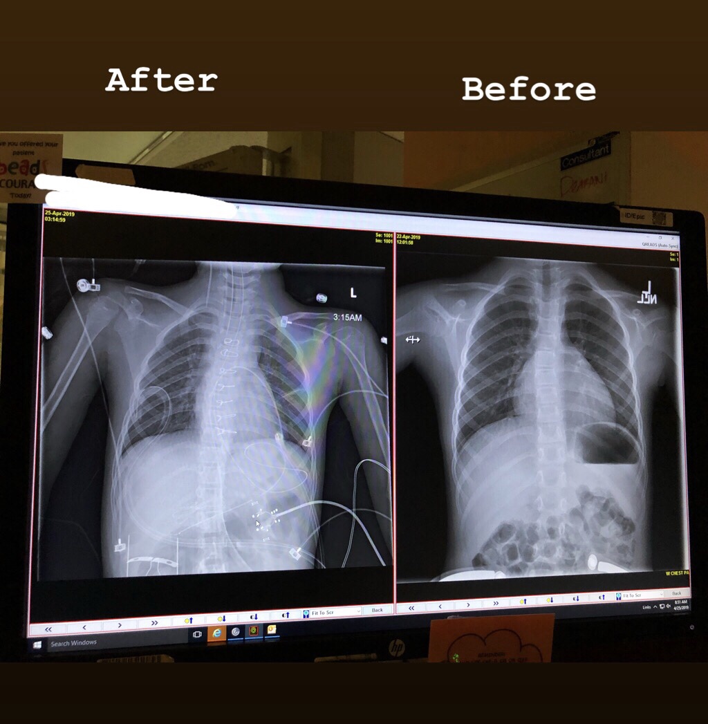 The procedure she actually had was a complete repair of Ebstein’s anomaly, by modified Cone technique with total valve repair, right reduction atrialplasty and subtotal closure of her atrial septal defect. In plain language that means they created a valve she didn’t have before using her own tissue, partially closed the hole in her heart and surgically reduced the size of her heart. You can see the size difference in her X-ray images pretty clearly.