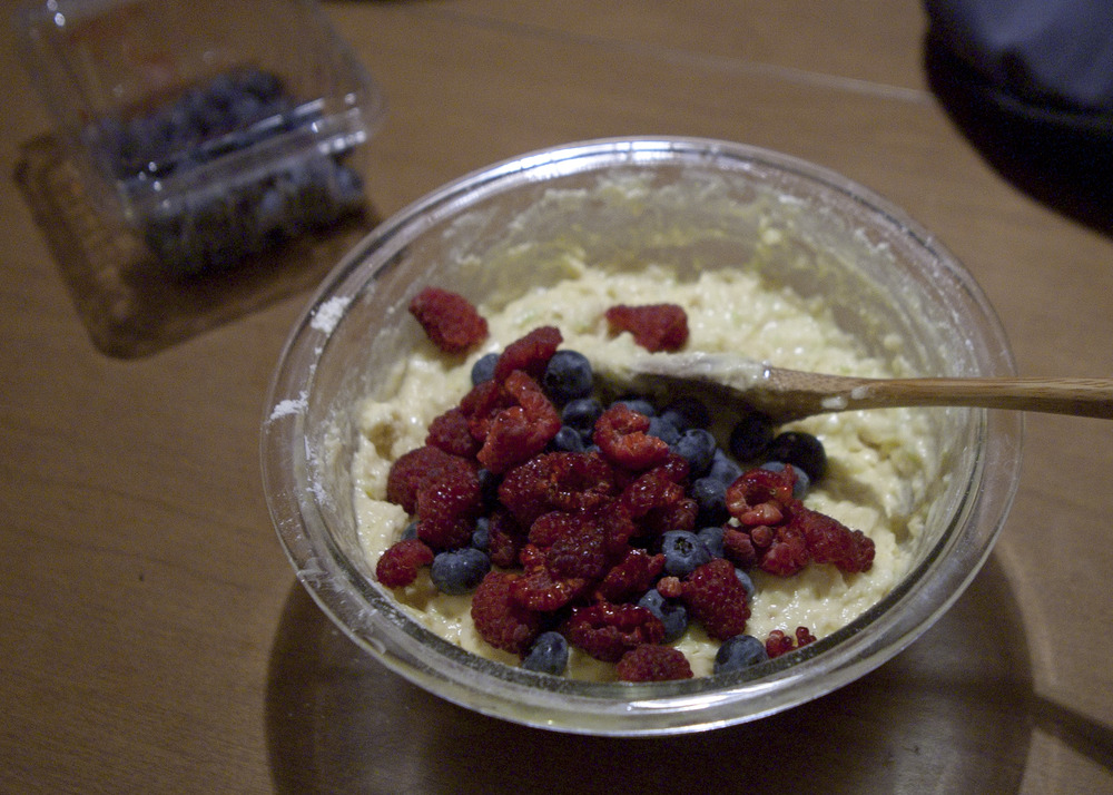 2. In a large mixing bowl, cream together butter and sugar until fluffy. Add eggs one at a time mixing well after each addition. Add vanilla and sour cream. Slowly add flour mixture until well mixed. Add shredded zucchini. Carefully fold in blueberries and raspberries.