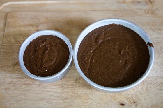 5. Pour into cake pans, filling 3/4 full. Place pans on cookie sheet and bake until a toothpick inserted in the center comes out clean. Times will vary based on cake pan size. The timing I use goes a little like this: 20 minutes for smaller cake pans and 40 minutes for larger cake pans. Just watch them, and keep a toothpick handy. It’s not that hard. I promise.