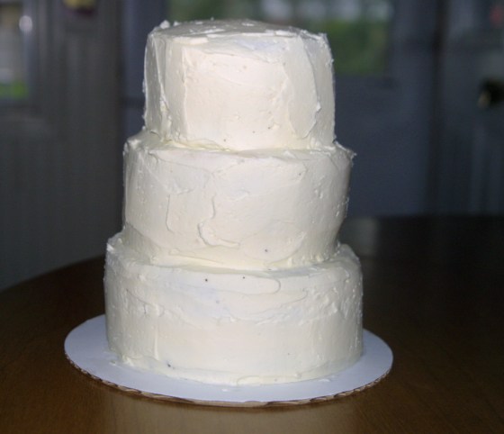 I did everything as I would have, had I been taking the cake to the actual wedding. Once completed I put the whole cake in the fridge to allow the frosting to set.