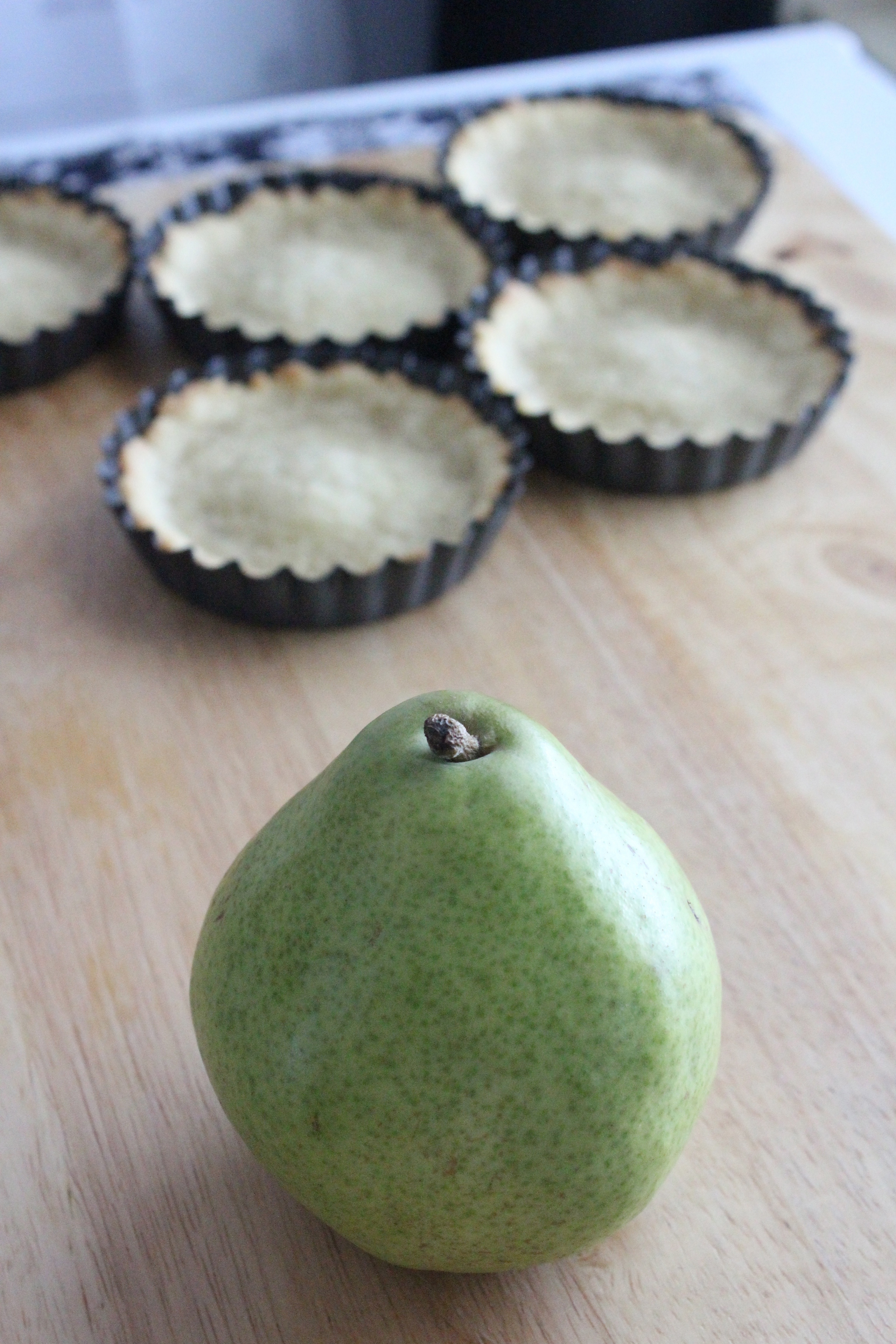 3. While the shells are baking, make the filling. Slice a few thin slices off of the pears to use as garnish. Place slices on a baking sheet lined with parchment paper and sprinkle with sugar. put in the oven, with the oven off, while still warm from making the tart shells. Dice remaining pears. Add to a medium pan, along with water, brown sugar and cinnamon. Cook over medium heat 20-30 minutes until tender. Mash with a potato masher. Push pears through a fine metal sieve to remove skins. Return to heat and cook another 10 minutes. Divide pear purée among tarts. Cool completely.