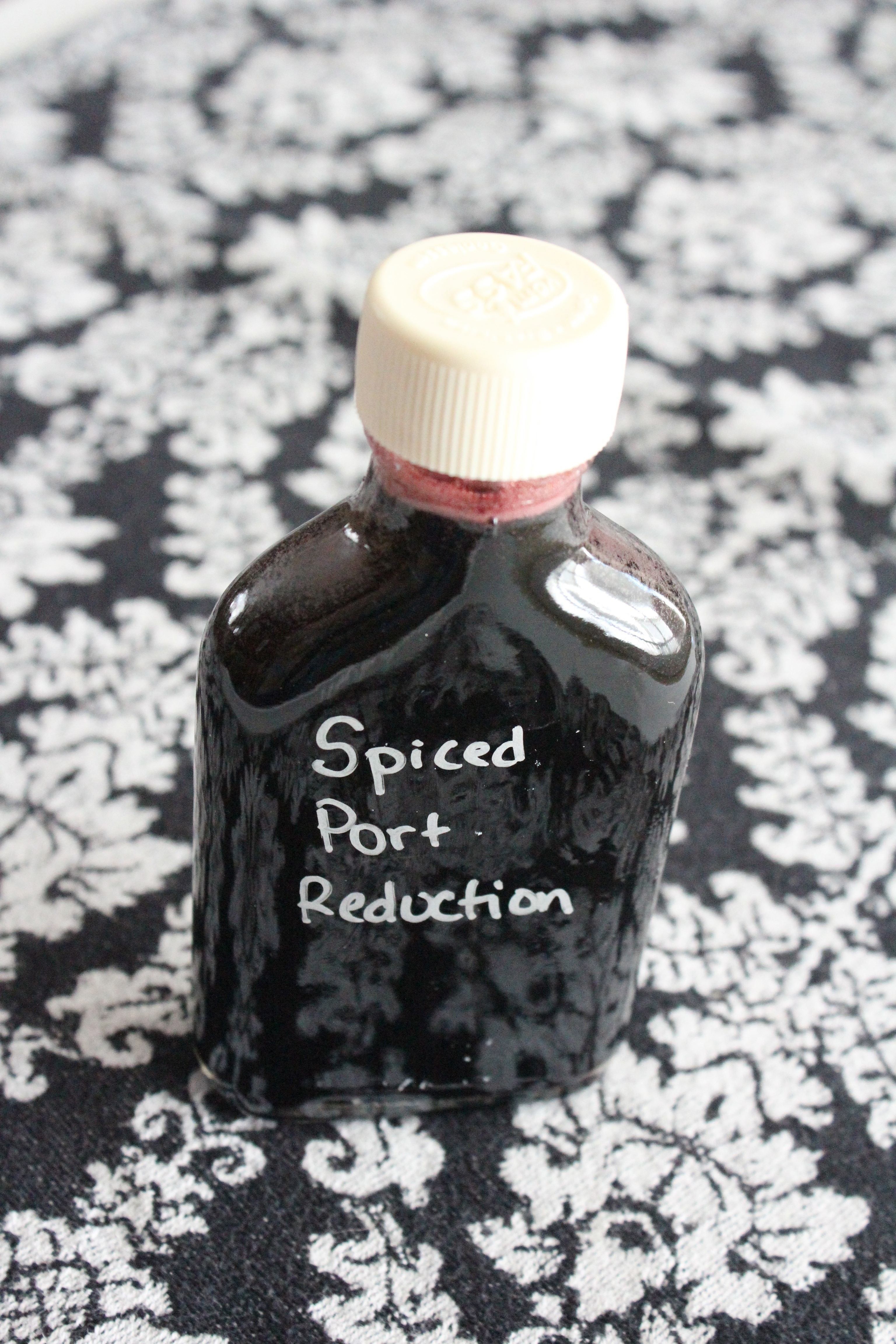 4. In a small saucepan heat the port, sugar, cinnamon, nutmeg and cloves over medium heat. Bring the mixture to a simmer and cook for 30-45 minutes, until it has reduced by half.