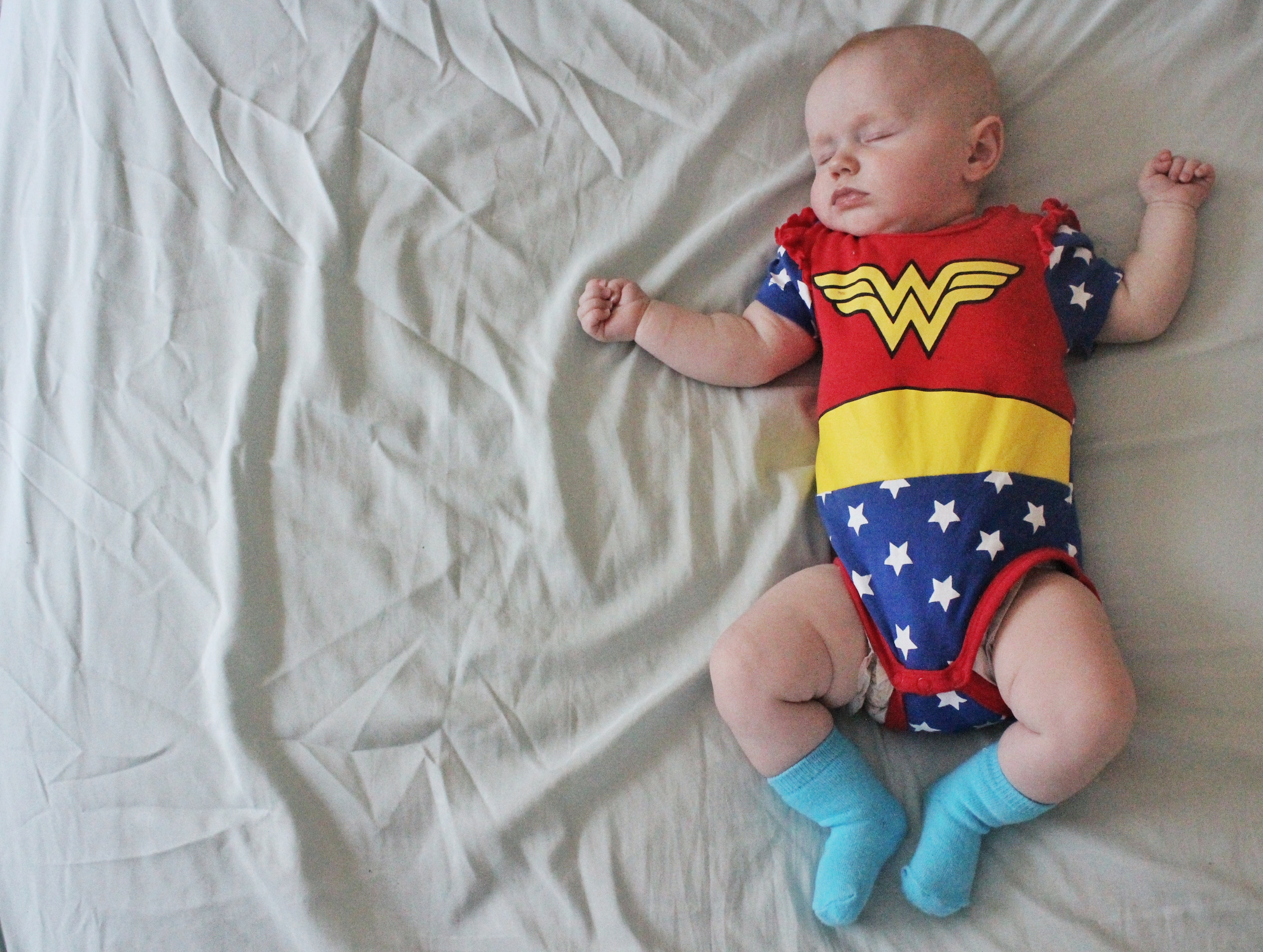 My husband is a huge comic book fan, so far she has Wonder Woman, The Hulk, Spider Man and Batman gear. Sadly they don’t make much comic stuff for girls, I had to order that onsie from Australia. Pretty sure this kid will be playing with action figures instead of barbies.
