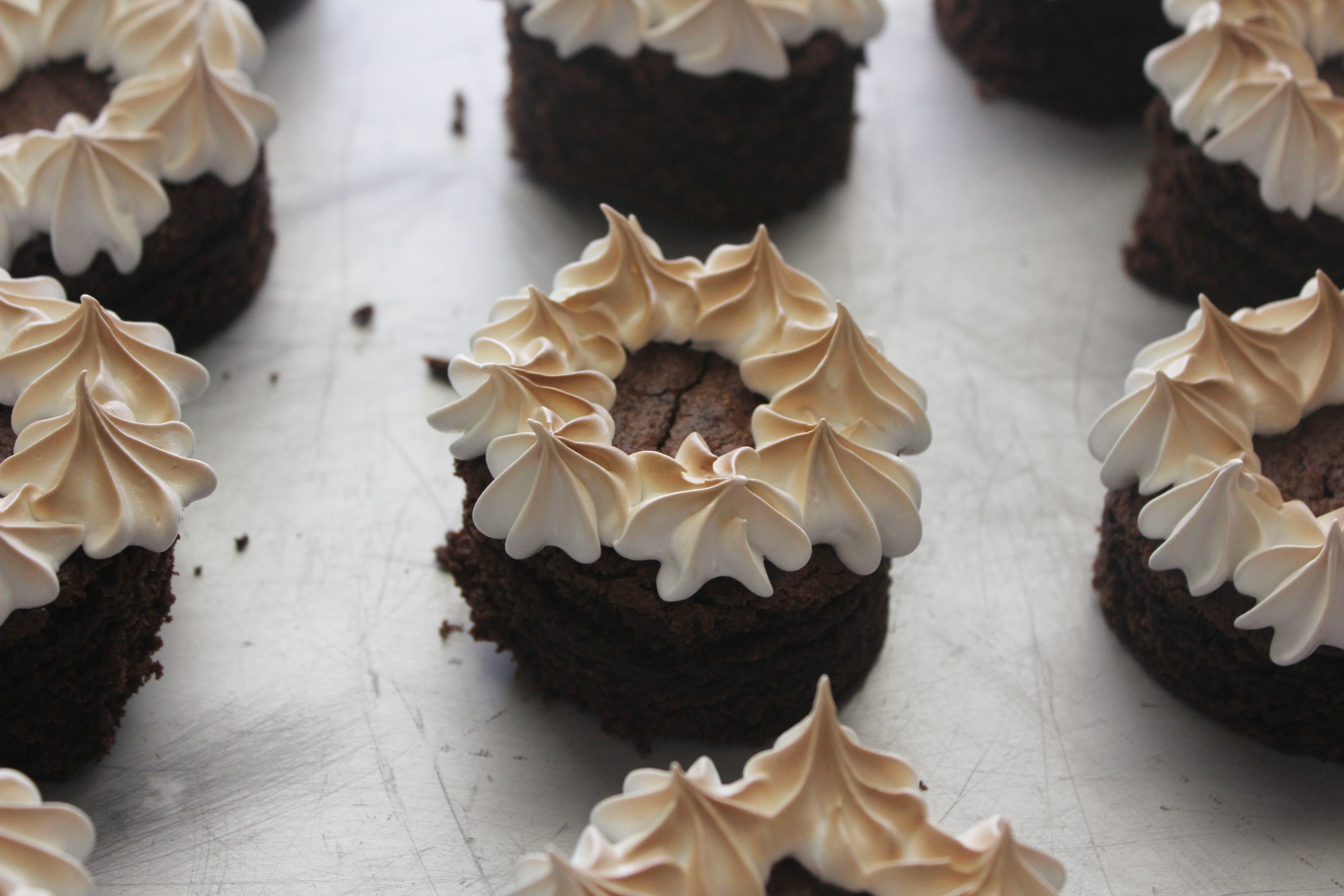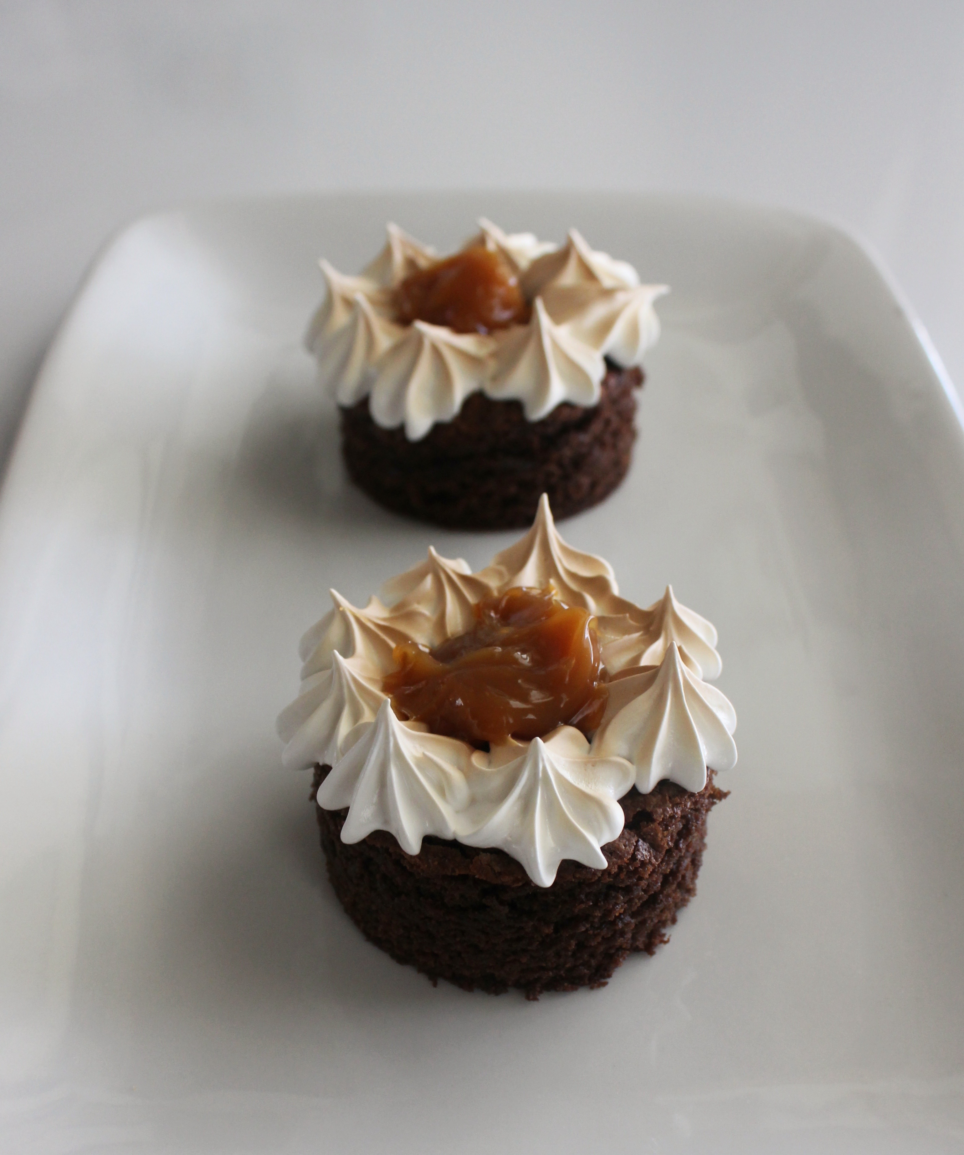 4. Assemble: using a ring mold or biscuit cutter, cut out brownies. Pipe rosettes of meringue around outside edge of brownies, toast meringue using a torch or under the broiler for 1 minute. Fill center with caramel.