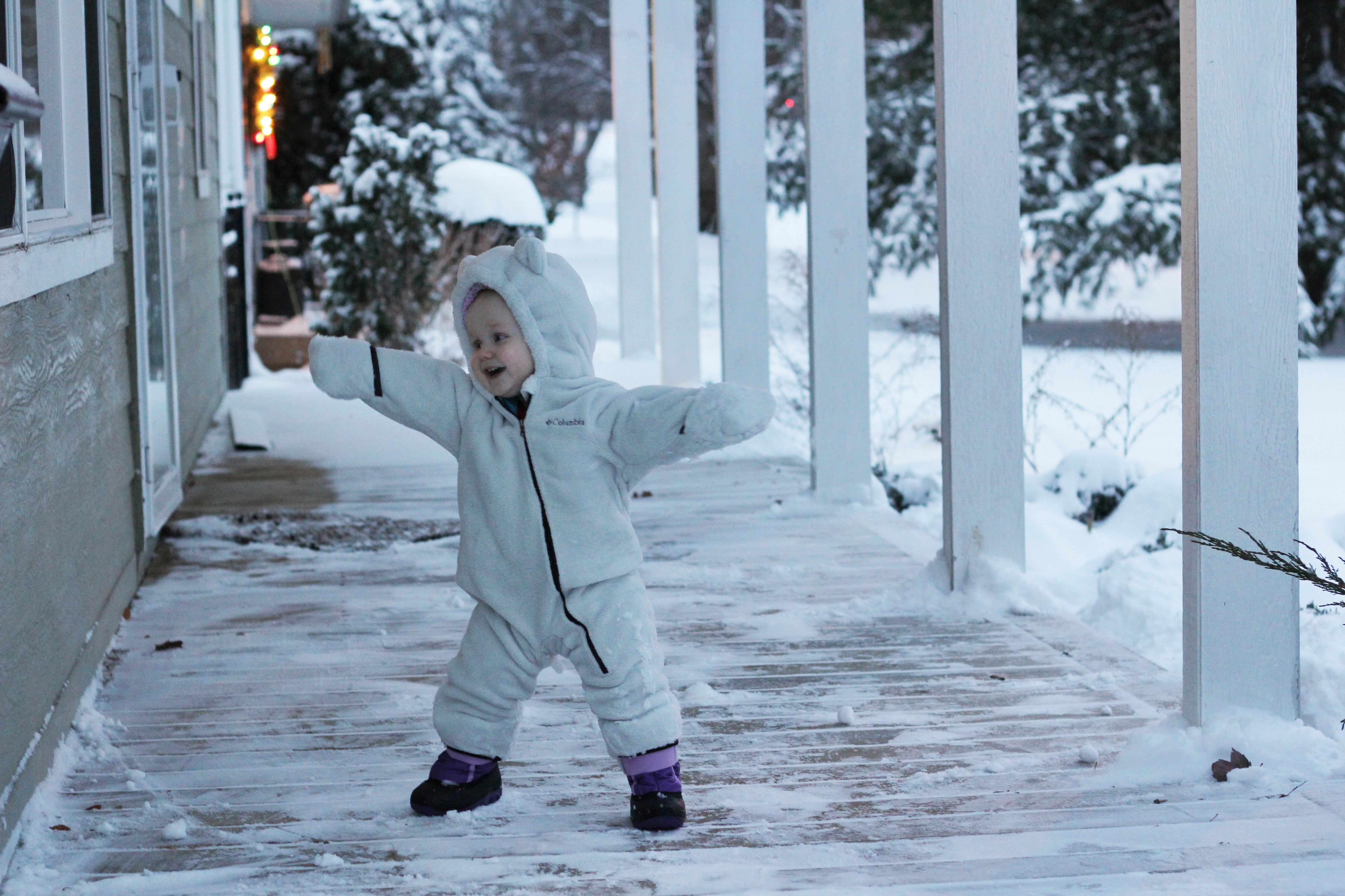 We had a bit of snow this last week, not as much as I would have liked, but enough to test out her snow boots. Don’t let this photo fool you, she didn’t really care for it. She couldn’t figure out how to move and became frustrated very quickly. I’m hoping we get another good storm so we can try again.