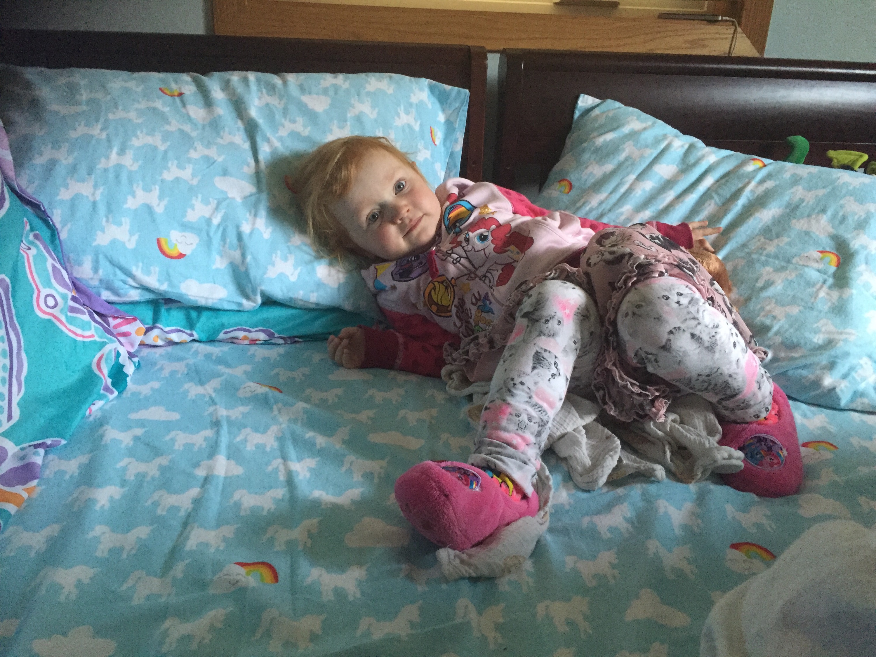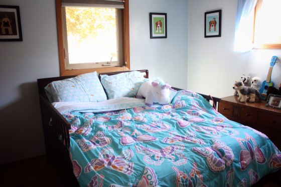She has been asking for a big bed for a while. She’s shared ours since she was three months old, and we decided to let her continue until she was ready for a change. As she’s been asking over and over, it seemed like time. For some reason, I got it in my head that I would build her a bed frame. So build it I did. It was simultaneously easier and more difficult than I had imagined. I used the pieces of her crib for the head board and bed rails. I also decided that her room needed to be painted and completely reorganized. The dog statues , were decorations I painted for her second birthday party last year. We keep adding pins to her fabric drawers, as she collect new ones, the newest from the heart walk this year. And the drawing of the little girl with the bunny. It was drawn by nurses in the NICU when she was an infant, and has hung on our bedroom wall since. I planned to move it to her room once she moved in as well. So finally it hangs in its rightful place. It’s followed her bedside from the NICU to the PICU, to our bedroom, and finally her own. As does the dream catcher made by my cousin, which hung above her isolette in the NICU as well. The ukulele was a Christmas gift from her Papa, a surprise for me as well, which brought me to tears on Christmas morning. And the animals, are souvenirs of her visits to the hospital, as she’s visited the gift shop on every trip. This kid has so much stuff. But it feel extra special to have her own room, completed , where she has spent the last week sleeping. Now I just have to stop worrying about her falling out of bed and sleep in my own bed again.