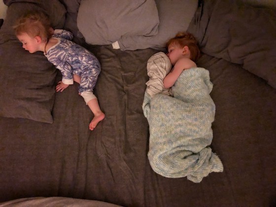 They continue to end up sleeping in the same bed. I often find myself wanting to just let them stay sleeping together, but find worry it will end in one of them screaming, considering how much they both move around in their sleep. Once the baby nurses less over night (because she still thinks she needs to nurse a billion times every night) I plan to have them sleep together but I don’t think they’re quite ready yet. It sure is cute for the amount of time I let them.